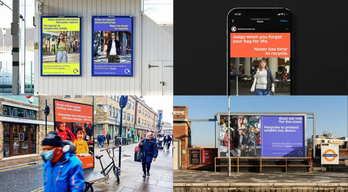 The campaign launched in 2021 with a suite of creative materials for outdoor, print and digital advertising. In its second year, it was updated and adapted for 3 bursts of advertising across 19 London boroughs, selected for their lower recycling rates and higher proportions of younger Londoners - ads ran across Facebook, Instagram, YouTube and physical out-of-home sites including on digital screens in underground stations.